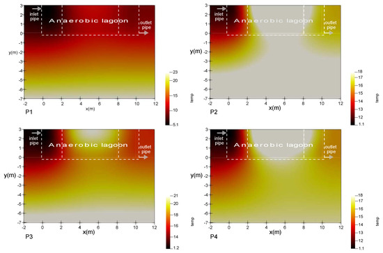 Figure 3 shows the temperature distribution in the proposed system under steady-state conditions for some examples of wastewater treatment plants whose information is included in Table 4. The lagoon contour has been illustrated in the first graphic. It is of interest to observe how the thermal behaviour within the lagoon depends on the boundary conditions, but also the hydraulic flow that is subject to the boundary values in the inlet and outlet pipe.