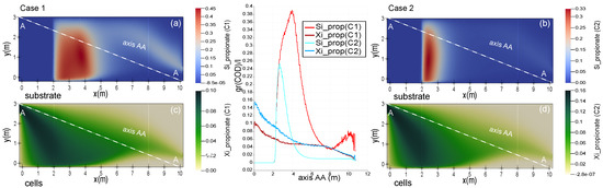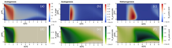 With respect to acidogenesis and methanogenesis, cells effectiveness on substrates removal is greater than in the acetogenesis due to the kinetic parameters. For the propionate and are and , respectively, (see Table 3). Thus, cells growth value and, therefore, the substrate removal is lower than in the previous two cases (see Equation (7)). The resulting value of substrate concentration in the outlet, after the wastewater treatment process, is between 600 and 500 (mg(COD)/L). In the case of acetic acid, this same concentration, next to the pond outlet, is smaller, due to the accumulation of organic matter that has not been reached by the microbial community.