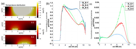 (a) Temperature distribution under three different scenarios; E-1 Ambient temperature, E-2 includes a heat source at the bottom of the lagoon, between coordinates 2 and 4, and the E-3 between 4 and 8, in the x axis. (b,c) Concentration of propionate and cells, respectively, along the axis AA (see Figure 5) for the different scenarios detailed in (a).