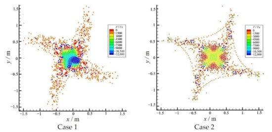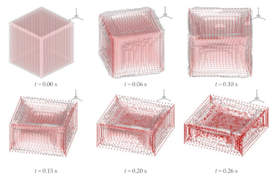 Figure 8 shows deforming states for four cases at the end of computation. For Case 1, the divergence occurs at t = 0.134 s in the simulation; for Case 2, the divergence occurs at t = 0.190 s; for Case 3, the divergence does not occur, but several particles are flying out of deforming region at t = 0.47 s with large velocities, which should be caused by an unphysical pressure extremum—besides, the deforming shape at the free surface of Case 3 is also incorrect (should collapse to the center); and for Case 4, no divergence and unphysical deforming shape occur, indicating a stable and correct 3D computation.