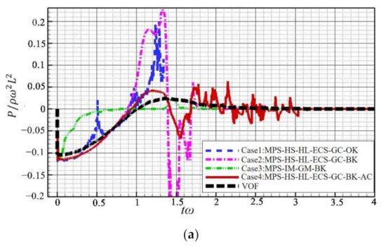 Figure 2 shows the time histories of the pressure and particle number density of a particle initially located at the center of the square fluid patch in the 2D MPS simulations, where the unit of tw is 1. As a comparison, the time history of the pressure at the same location of the VOF simulation and BEM simulation result [39] is also plotted in Figure 2a. It is clear that: