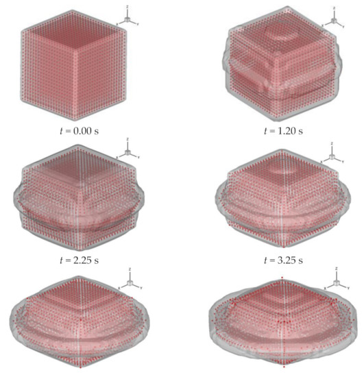 With the combined method of Case 4, we simulated another case of a 3D cubic fluid patch extruding, as shown in Figure 11, in which the half patch of fluid where z > 0 is firstly initialized with a velocity of 0.1 m/s along a negative z axis while the left patch is kept stationary. In the fluid extruding case, the particle is forced to be approaching, which more easily cause particle disorder and clustering, leading to instability. Figure 11 shows the whole evolution of a fluid patch, as indicated by the red particles. The evolution pattern simulated by the VOF was also shown by the iso-surfaces of the water volume fraction between 0.01 and 0.5. It can be observed that the deformation of the cubic patch of fluid calculated by the MPS method is relatively smooth, and the free surface evolution is in good agreement with the results calculated by the VOF. No spurious instability occurs in the simulation process, verifying the accuracy and reliability of the MPS simulation by the proposed methods’ combination.
