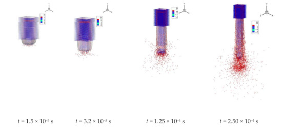 Figure 14 illustrates a comparison of the liquid jet calculations in the static airflow between the MPS integration and the VOF methods. The jet simulated by the VOF indicates the iso-surfaces of the water volume fraction to be 0.5, which demonstrates a shape of the unbroken continuous interface, as shown in the gray translucent surface (see Figure 14). The calculation using the MPS integration method is indicated by particles in the figure, in which red particles represent free particles (B = 0), while blue particles refer to internal particles (B = −1), or wall virtual particles in particular if at the nozzle (B = −2). Figure 14 demonstrates that the position of the continuous fluid interface calculated by the MPS integration method is substantially coincident with that of the interface by the VOF method. In the early stage of jetting, the VOF captures a clear interface since the liquid interface has not been significantly broken. However, as the jetting continues to penetrate due to the shearing effect between the liquid jet and the surrounding air, some free surface particles gradually fall off from the continuous fluid interface to form atomized droplets. The VOF fails to describe this process in detail. In contrast, the MPS integration method captures the gas–liquid interface and the movement of atomized particles, forming a clear simulation picture of the atomization process. This reflects the characteristics of the MPS integration method. Besides, a central continuous jet column is formed in the late stage of jetting, which is consistent with the results by both the MPS and VOF methods. This further verifies the reliability of the method adopted in this paper.