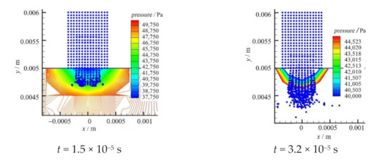 The initial mesh and boundary conditions are provided in Figure 13. The square jet had a size of 0.5 mm × 0.5 mm, with a particle spacing of 0.05 mm. The liquid jet velocity was 20 m/s, and the initial pressure of the gas phase field was 50,000 Pa.
