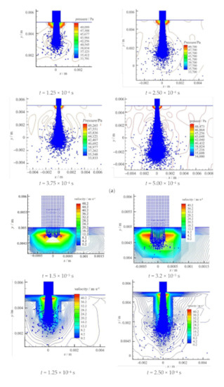 Results of the coupling of the liquid jet in the static airflow at an injection speed of 20 m/s (liquid particles, pressure contour of z = 0 plane, velocity vector): (a) maps of the pressure contour change over time; (b) maps of the velocity contour change over time at the liquid jet velocity of 20 m/s.