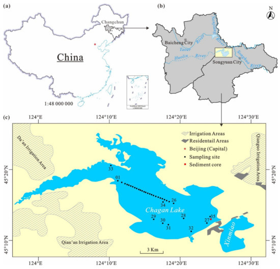 - Guo, W.; Wang, Y.; Shi, J.; Zhao, X.; Xie, Y. Sediment information on natural and anthropogenic-induced change of connected water systems in Chagan Lake, North China. Environ. Geochem. Health 2019, 42, 795–808. [Google Scholar] [CrossRef] [PubMed]
