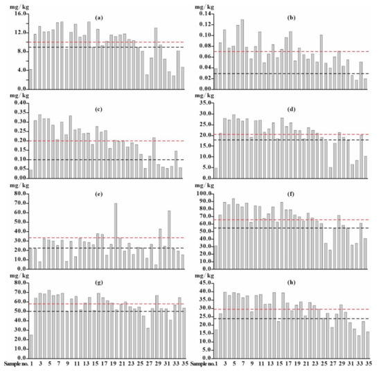 Heavy metals concentrations in the surface sediment from the Chagan Lake. (a) As, (b) Hg, (c) Cd, (d) Cu, (e) Pb, (f) Zn, (g) Cr and (h) Ni. (Black dash line-background value; Red dash line-mean concentration).