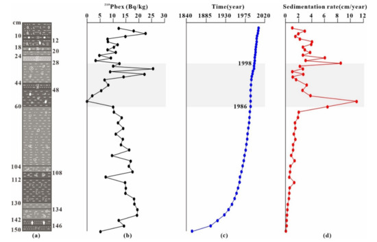 Geological features (a), specific activity distribution of 210Pbex (b), chronological sequence dated (c), and sedimentation rate by 210Pbex Constant Rate of Supply (CRS) (d) in the sediment core of the Chagan Lake.