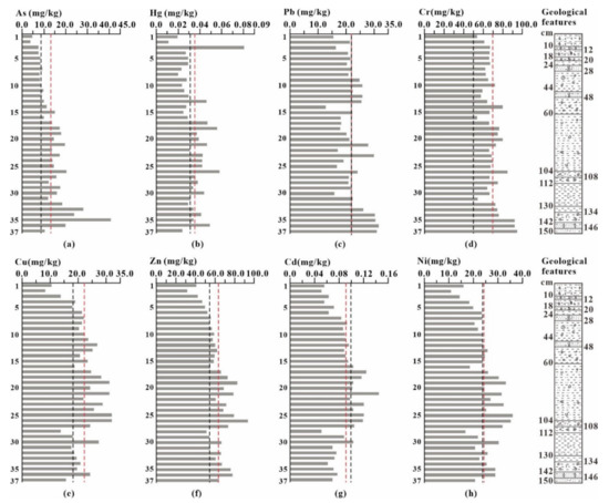 Concentration profiles of heavy metals in the sediment core from the Chagan Lake. (a) As, (b) Hg, (c) Pb, (d) Cr, (e) Cu, (f) Zn, (g) Cd and (h) Ni. (Black dash line-background value; Red dash line-mean concentration).