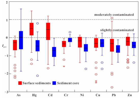 Box plot of Igeo in the surface sediments and sediment core of Chagan Lake.