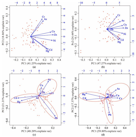 Figure 6 shows the biplot of PC1 and PC2 obtained from PCA and RPCA for raw data, logarithmic transformation data, and ilr transformed data. Among these datasets, the ilr transformed data, which has been opened and the closure effect eliminated, showed a radial pattern as a whole (Figure 6c,d). In contrast, as for the PCA result based on the raw data and logarithmically transformed data, which belong to Aichision space, all elements presented a one-sided trend due to the closure effect (Figure 6a,b). On the other hand, the transformed datasets yielded a higher total variance explained values for PC1, PC2 components than those in raw data. And the PC1 component derived from ilr transformed data with RPCA method accounted for the highest total variance explained values than other datasets, which indicated that the components obtained after eliminating the influence of outliers were more representative. From the element associations perspective, it can be concluded that: (1) the raw data and logarithmically transformed data showed similar element associations (Figure 6a,b), and the corresponding loading values of all elements for PC1 were all positively correlated. Although there existed a slight difference in the PC2 component, the relationship between elements could not be well ascertained. (2) In contrast, the biplot pattern of ilr transformed data was quite different, owing to the opening operation on the dataset, the element association was clearly revealed (Figure 6c,d). The only difference between element associations was that the RPCA approach eliminates the interference of outliers in the data, enhancing the accuracy of element association selection than the PCA approach. As a result, based on the RPCA with the ilr transformed data, three primary sources can be identified from the association of elements in Figure 6d: (1) Cr, Ni, As, Cu, Zn; (2) Hg, Cd; (3) Pb.