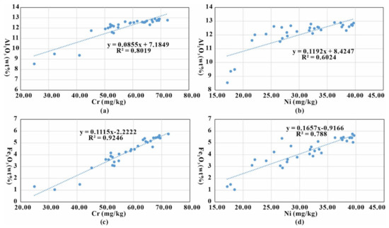 Distribution diagram of Cr and Ni (mg/kg) versus Al2O3 and Fe2O3 (wt %) in the sediments of Chagan Lake. (a) Cr versus Al2O3, (b) Ni versus Al2O3, (c) Cr versus Fe2O3, (d) Ni versus Fe2O3.