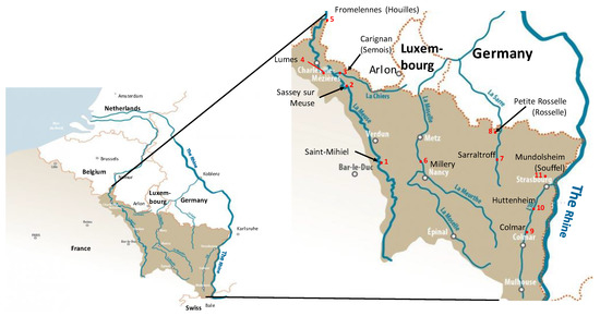The geographical locations of the eleven experimental sites (1–11). Several sites were located on the tributaries of major rivers (the Meuse, Moselle, Sarre and Ill). The tributaries are indicated in brackets.