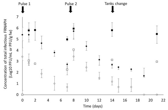 The second part of this study focused on FRNAPH accumulation and release kinetics in zebra mussels. The concentrations of infectious FRNAPHs in water and mussel soft tissue were measured continuously throughout the three weeks of the laboratory experiment (Figure 3). Twenty-four hours after the first pulse, the FRNAPH concentrations measured in the water were 2.83 Log10 PFU/mL and 5.39 Log10 PFU/mL under the 1X and 100X conditions, respectively. At the same point in time, the FRNAPH concentrations measured in the mussels were 3.08 Log10 PFU/g and 5.78 Log10 PFU/g under the 1X and 100X conditions, respectively. The FRNAPH content of the mussels was twice as high as that of the water after one day of exposure. A similar result was obtained after the second pulse (day 8).
