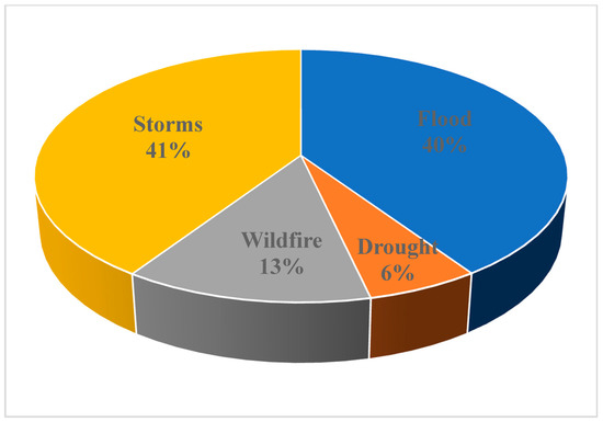 Fraction of Canadian natural disasters attributed to event types from the CDD (1900–2020) [13].