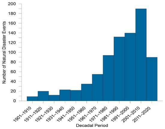 Frequency of occurrence of natural disasters across Canada by decade since the start of CDD records [13]. The most recent decadal period is incomplete, with CDD up to 2020 included in this analysis.
