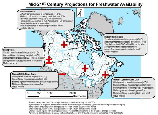Projected change in streamflow for the mid-21st century in Canada’s major drainage basins, and synthesis of projected hydroclimatic changes reported by CCCR2019 [3]. Degree of confidence determined by agreement among various studies and projections, while robustness refers to the amount of evidence available [17].