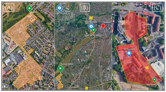 Location of monitoring sites in Münster (B) and in detail: Canisiusgraben (A) and Stadtgraben (C), with decentralized stormwater treatment systems (DS) positions (green marks), rain gauge (RG) positions (blue infopoint marks), and sewer catchment (orange and red framed areas). (Image © 2021 Google Earth).