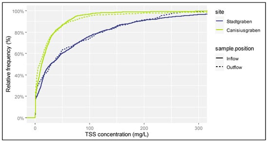 Figure 2 shows the distribution function of determined TSS concentrations. The lower graphs of SG inflow and outflow illustrate the higher TSS pollution of the catchment, in comparison to CG. The progressions of in- and outflow graphs per site are narrow. This is covered by the descriptive TSS statistic.
