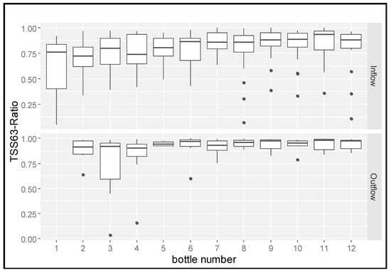 TSS63 ratio per composite sample bottle at SG during event sampling. Each bottle represents a 10 min time step. With numbers of samples per boxplot: for inflow min = 14, and max = 19 and for outflow min = 6, and max = 8. Boxplots with whiskers for inflow and outflow ratios summarize the statistical description of all bottle samples and show mean, median, 0.25 and 0.75 percentile, and 1.5 × inter-quartile range (IQR). Outliers are indicated as black dots.