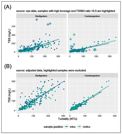 Figure 4 shows the linear relationship between TSS and turbidity that can be observed (A) with and (B) without samples that meet the selection criterion. The similar gradient coefficients also emphasize a similar particle characteristic per site. Both DS treat the polluted runoff mainly through sedimentation.