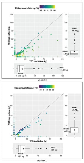 Values under the separation line indicate a positive removal efficiency, whereas values above the line indicate a negative efficiency. At site SG, events with negative efficiencies are visible, which occurred in period 2 and therefore have a decreasing effect on the removal efficiency in comparison to period 1. At site CG, events with negative efficiencies occurred in periods 1 and 2. Removal efficiency ranged between −120% and 100% at site SG, and −35% to 96% at site CG. TSS load mean values decreased at each site from inflow to outflow, from 16.4 to 11.2 kg at site SG, and 13.9 to 11.0 kg at site CG.
