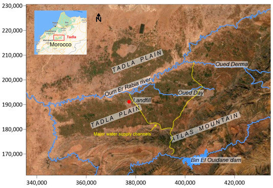 Geographical framework and location of the Souk-Sebt landfill in the Tadla plain. UTM coordinates in metre using Lambert conical conformal projection (Morocco zone 1).