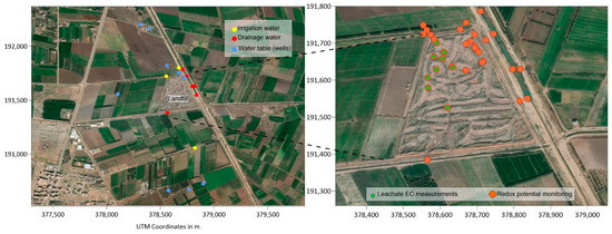 Measurements of temperature, electrical conductivity, pH and redox potential were carried out in the field, in situ in the leachate, and on samples taken from the water table from wells and boreholes located around the landfill, as well as from plot drains and irrigation water. The equipment used is a Hanna Instrument HI98150 pH-meter (Hanna Instrument, Lingolsheim, France). The redox electrode is a platinum electrode with a KCl/AgCl2 half electrode. The potential of the half electrode, which is temperature-dependent, has been added to the voltmeter reading to obtain the redox potential Eh. The redox measurements were carried out on site, taking care not to cause oxygenation of the medium during measurements and sampling. In order to reduce the time needed to stabilise the measurements when changing redox environments, the measurement campaigns were grouped together, i.e., all the measurements in the leachate were grouped together on the same day, then the measurements in the groundwater or irrigation water were carried out the next day, for each campaign (April, June and July 2020). The 9 wells closest to the landfill, and located both upstream (South and East sectors) and downstream (West and North sectors) were characterised in situ and sampled, and 11 measurement points were defined for monitoring the characteristics of the irrigation and drainage water in the plots. Finally, 27 measurement points on seasonal leachate ponds were characterised inside the landfill. All the characterisation points are grouped together in Figure 2.