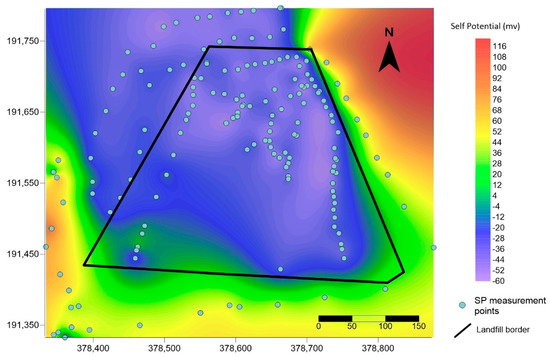 A total of 165 spontaneous potential measurement points were carried out over the 3 campaigns inside and outside the landfill. The range of values is wide, from +90 mV observed to the south east, outside the landfill to −65 mV observed inside the landfill. Mean values and standard deviation are presented in Table 1. The SP measurements carried out outside the landfill show a relative stability over time, from one campaign to another. Some rare differences appear on the western edge of the landfill with values alternately shifting from negative to positive and then negative again depending on the 3 campaigns. Due to this stability over time, the results of the three campaigns have been grouped together and are presented in Figure 3, where the negative values, likely associated to low redox conditions, indicate the position and direction of the pollution plume towards the north-northwest of the landfill (Figure 3). The measurement points that differed between the campaigns were found to be located at the very edge of the plume. On the other hand, inside the landfill the observed values were always negative, but there was a greater variation between measurement campaigns. These variations accompany the restructuring of the waste swaths as trucks pass by, the dumping of newer waste and the relocation of low points and leachate ponds.