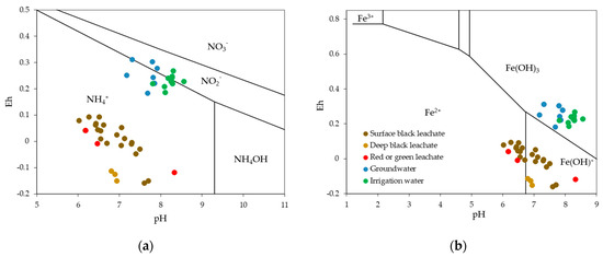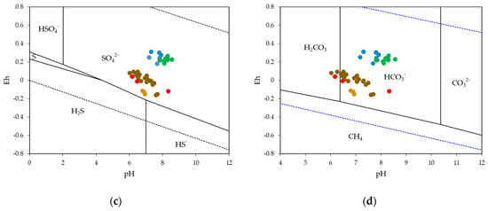 Pourbaix diagram showing the species stability domains for irrigation water, ground water and leachates for (a) N, (b) Fe, (c) S, and (d) C.