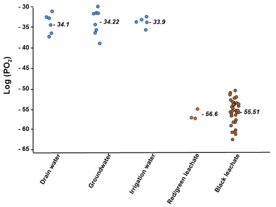 The redox potential ranged from −0.16 to +0.1 Volts, with a pH range of 6 to 8.35. The combination of these values is shown in the Pourbaix diagrams of nitrogen, iron, sulphur and carbon (Figure 4a–d). The equilibrating partial pressure according to the type of leachate is presented in Figure 5. The range was from 10–63 to 10–50 atm. The leachate typology observed and mentioned above seemed to correspond to different degrees of reduction, with red or green leachates showing the least reducing values. Similarly, there was a difference between the redox characteristics of surface (slightly less reducing) and depth for black leachate. In addition, during each field campaign, we have always observed a certain amount of waste burning in the landfill.
