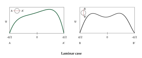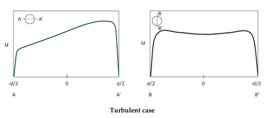 Velocity profiles for helical one-phase flow under laminar regime (upper part) and turbulent regime (lower part) (u = flow velocity; d = pipe internal diameter).