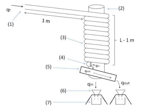 In each separator, the dispersion (or emulsion) to be treated was introduced under pressure from the top (see 1 in Figure 3), and at the lower end (4), at atmospheric pressure, the flow was split into two streams (qin and qout) by dividing the original pipe section into two equal semicircles, which were separated by the wall of the coil mold (that was 0.3 mm thick). The flows obtained were driven towards two separate funnels (6), and then into two different plastic vessels (7). With this approach, it was sought to disturb the streamlines at the end of the pipe as little as possible to prevent a water and oil remix.