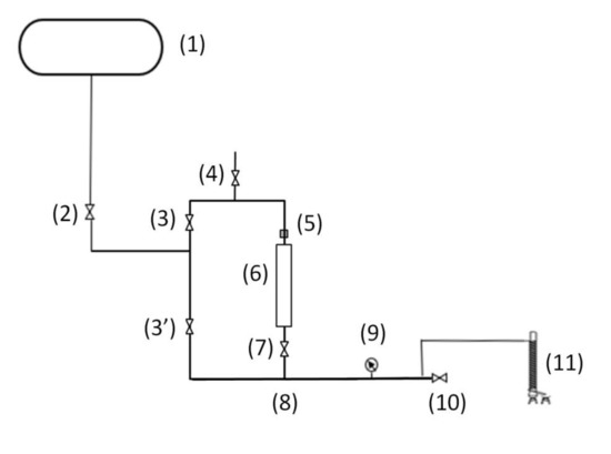 Hydraulic system scheme with: (1) olive oil tank; (2), (3), (3′), (7), and (10) auxiliary sphere valves; (4) air purge valve; (5) removable coupling; (6) water injector pipe; (8) oil–water mixing zone; (9) digital manometer; (11) helical separator.