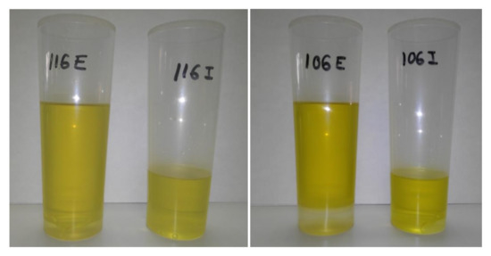 Once olive oil and water have been fed into the hydraulic system by opening valves (3′) and (7), with a larger or smaller aperture, different concentrations of both fluids could be injected at the mixing zone (8). At point (9), a digital manometer was placed (with a maximum operating pressure of 20 m.W.C and accuracy of ±2%) to measure the pressure head at the inlet of the separator (11). In this context, numerous tests (not less than 20 per separator) were carried out at different pressure heads and outflow rates (as will be shown later) to analyze the hydraulic performance and separation yields of these devices under different conditions. In each experiment, the samples from the outer and inner sides of a given separator (Figure 5 as an example), were collected in coded and tared plastic vessels for their subsequent, efficient management. To enable the measurement of the volumes of olive oil and water contained in each sample, the following procedure was applied: samples taken in each experiment were stored and protected for further study. Then, they were weighed by using a laboratory scale with a precision of ±0.1 g. After this, the samples were placed in an oven at 105 °C for several days until the water was completely evaporated (checking the weights regularly until the final weight loss was verified). From the value of the last weighing, and the difference in the readings with respect to the pre-drying measurement taken, the weight of the oil and water content present in each sample could be estimated in each case. From this information, the corresponding volumes, of water and olive oil in each sample, could be computed by taking into account the density of each fluid. Accordingly, water density (ρw) was taken from the values tabulated in Singh and Heldman [22]; olive oil density (ρo) was estimated from the following experimental function [23], determined particularly for the olive oil used in these tests (in which T is the oil temperature in °C, ρo is computed in kg/m3, and SE = 2.040 kg/m3 is the standard error):