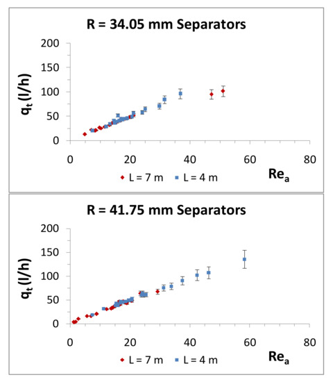 Relationship between the apparent Reynolds number Rea and the total flow qt (l/h) for the separators tested with different helix radiuses R (34.05 mm and 41.75 mm) and tube lengths L (4 and 7 m).
