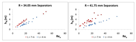 Relationship between the apparent Reynolds number Rea and the head losses hfk (m) for the separators tested with different helix radiuses R (34.05 mm and 41.75 mm) and tube lengths L (4 and 7 m).