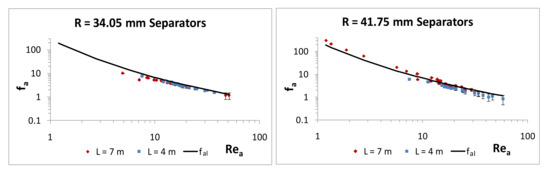 Relationship between the apparent Reynolds number Rea and the friction factors faI and fa for the separators tested with different helix radiuses R (34.05 mm and 41.75 mm) and tube lengths L (4 and 7 m).