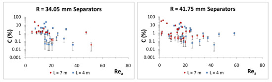 On the other hand, if Figure 7 and Figure 9 are observed together, a certain relationship seems to be established between the variability of C and the scattering of hfk. In this sense, the data from the separator with R = 41.75 mm—L = 7 m, and from the case with R = 41.75 mm—L = 4 m, are worth highlighting, because the former has the most dispersed values of C and hfk, and the latter shows the least dispersed values of those variables. Viewing this, it is reasonable to suppose that the more the C values differ in the tests, the more the variability in the viscosity present in the flows, which will result in a wider scattering of hfk. Likewise, the degree of mixing (or emulsification) in the flow can also influence this variability, a fact that could explain the scattering that hfk shows, for Rea > 20 and C < 2%, in the separator with R = 41.75 mm—L = 7 m (a great dispersion of hfk is observed in Figure 7, despite the fact that C changes very little in Figure 9 for the referred range of Rea).