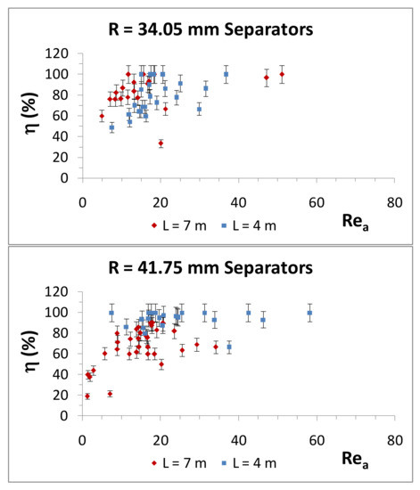 where qwout is the water flow rate collected from the outer side of the separator and qw, according to Section 3.1, is the water flow rate entering the separator (qw = qwin + qwout, with qwin as the water flow rate from the inner side of the separator). As an example, Figure 10 shows an image of one of the tests performed, in which the main part of the water flow rate is present on the outer side of the separator, and the oil flow rate is basically placed on the inner side. As expressed in Equation (17), a relative separation yield is equal to 100% when qwout = qw (the water is collected in its totality from the outer side and qwin = 0). If qwout = 0 it so happens that qw = qwin, and the separation yield η will be null, which implies that the water is completely extracted from the inner side of the separator (an undesired situation because the water would be expected to be collected from the outer side as it is a denser fluid than oil). These two cases are extreme, but they help to interpret the results that are presented below. To this end, Figure 11 shows the values of η as a function of Rea for the separators tested. On the whole, from the cited figure it is highlightable that, from a given Rea value, the separation yields improve, reaching values of between 80% and 100% in most cases. Specifically, for approximately Rea > 15, acceptable η values can be observed in all the separators, so that it can be inferred that these devices comply with the purpose for which they were designed. On these lines, also notable is the performance of the separator with R = 41.75 mm—L = 4 m, which presents values of above 80% in practically all the experiments (even for Rea < 15). However, the fact that for Rea > 15 there may be other cases in which η < 80% suggests that Rea is not the only variable to take into account for establishing the best operating conditions. That is why, in the next sections, more relationships between parameters will be explored to verify which variables could be the most significant ones to consider.