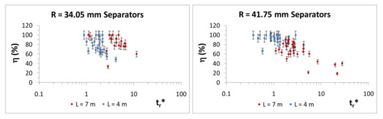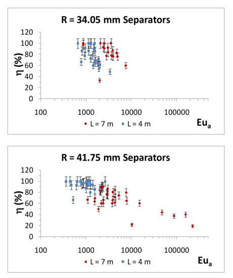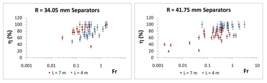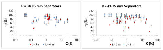 It can be seen that, at very low water concentrations, the variability of separation yields η is high, which suggests that the water concentration C, by itself, is not the only variable to be considered in the search for adequate separations. However, the best performance values (η > 80%) seem to generally be linked to a working area in which C < 5%. From this value (C > 5%), there seems to be some stability of η, tending to be in the range of 60–80%. This working area is not deficient, but it could be improved, which sets a context in which advancement in the design or handling of these devices could be studied. For its part, the separator with R = 41.75 mm and L = 4 m seems to maintain good results (η > 80%) even for C > 5–10%, which underscores this idea. As was remarked in Section 3.3, there are few studies addressing the relationship between phase concentrations and separation yields in helical devices. According to Vallesquino and Molina [6], it is not recommended to work with oil concentrations of above 2% in water–olive oil systems. In other studies [5,20,21], in the field of water–mineral oil systems, very acceptable separation yields could be obtained for oil concentrations of the order of 0.4%. Other authors [19], report one case (in mineral oil–water systems) in which, for a water concentration of close to 47%, it was possible to reach a separation yield of the order of 80%. Analyzing these references and the data presented herein, it seems reasonable to consider that η, in oil–water systems, could be greater at higher concentrations of the minority phase (Cmp) than in water–oil systems, which could be due to the viscosity of the majority phase. As any oil is usually more viscous than water, the flow tends to be more stable in oil–water systems (there is less turbulence) than in water–oil systems for a given Cmp value. This agrees with the assumption that the separation phenomena are normally promoted in those systems less affected by disturbances [28].