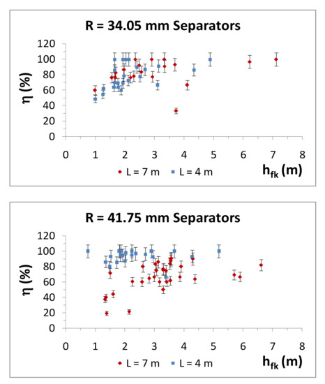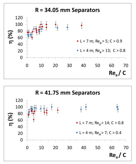 For those reasons, in Figure 13 the values of η are displayed as a function of those of Rea/C (taking C as a percentage) from certain threshold values that seem to be characteristic in each separator. Considering these results, it is reasonable to assert that, with enough energy and adequate water concentrations (Rea/C higher than 5–10), the separators constructed can provide adequate separation yields. Since Rea values have been limited in this work (given the means available), the separation yields (in general) have not been satisfactory for water concentrations C > 5%. However, according to the results presented in Figure 13, it seems possible to guess the likelihood of obtaining better separation yields, for water concentrations C > 5%, if the energy available were to be greater (maintaining Rea/C > 5–10). This opens up an area for improvement that should be considered in future works. The fact that C has to be higher than a certain threshold value (of the order of 0.4–0.9% depending on each separator) might be explained by the mixing or emulsion degree reached by the flow. In this respect, it must be noted that after re-using the same olive oil on successive occasions with the same separator, part of it was intimately emulsified with the water used (in these cases, dp could probably be of the order of some microns), and that phase was hardly separable. Hence, below a certain water concentration C (not controllable) the separation yields were not as expected and the head losses hfk were randomly scattered in some tests (remember the information in Section 3.3).