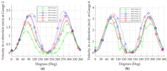 In Figure 9a,b, the velocity in the x-direction was correlated with different gauges. The gauges were placed at a 90-degree angle, where the velocity in the x-direction was highest, as shown in Figure 8, and the gauge heights differed in the z-direction. The details of the locations of the gauges are displayed in Figure 3 and Table 3, respectively. Gauges 1–4 were located in the water phase, whereas Gauges 5–7 were located near the free surface, and Gauges 8–14 were located near the wave breaking point above the mean water level. Figure 9a shows that Gauges 1–4 had small variations between them, with the maximum velocity in the x-direction near 2.5 m/s during wave breaking. In Gauges 5–7, the maximum velocity in the x-direction was about 3.5 m/s near the mean water level. In Gauges 8–14, where the gauge height was near the wave breaking, the maximum velocity in the x-direction was about 6 m/s.