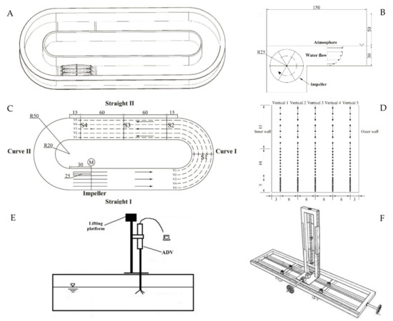 Schematic diagram of circular flume and arrangement of measuring points. (A) Generalization of physical model of flume, (B) working schematic, (C) layout of measuring section and vertical line, (D) arrangement of measuring points on each vertical line, (E) schematics of the velocity measurement system, (F) schematics of the lifting platform.