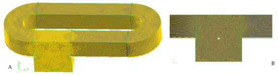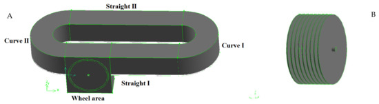According to the physical model shown in Figure 1A, the software Gambit (the version number was 2.4.6) was used for modeling at a proportion of 1:1. For convenience of expression, the model was divided into Straight I, Curve I, Straight II, Curve II and the wheel area. An overall generalization of the model is shown in Figure 2A, and the generalization of the wheel area is shown in Figure 2B.