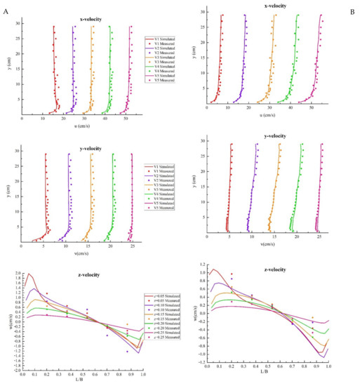 Section S1 (see Figure 1C) of curve I and section S2–S4 of straight II were selected for verification analysis. The locations of the sections are shown in Figure 1C. The positive direction of the 3D flow velocity simulation values was adjusted to be the same as the positive direction of the ADV test results. According to the simulated and measured results, the data of five lines in each cross-section were plotted in the same figure. When the longitudinal and transverse velocity was plotted, the X-axis was the flow rate, and the Y-axis was the height from the bottom of the flume. To make the figure beautiful and clear, the longitudinal velocity of vertical line V2~5 was increased by 10 units for drawing, and the transverse velocity of vertical line V1~5 was increased by 5 units for drawing. When the vertical velocity was plotted, the X-axis was L/B (L was the distance from the measuring point to the inner wall, and B was the trench width, taken as 30 cm), and the Y-axis was the velocity.