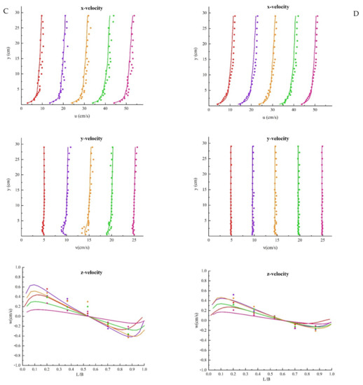 3D velocity distribution and verification of each measured vertical line in Section S1–S4. (A) Section S1, (B) Section S2, (C) Section S3, (D) Section S4.