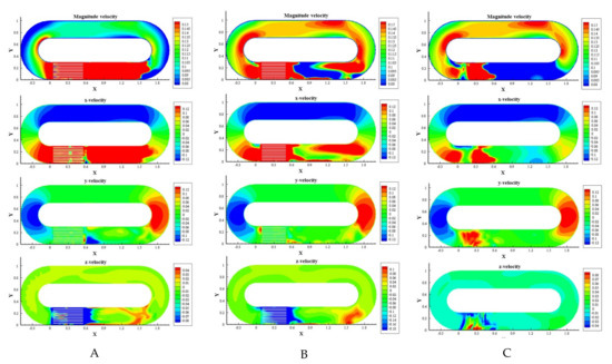 3D velocity distribution at different elevations in flume. (A) z = 2 cm, (B) z = 15 cm, (C) z = 28 cm.