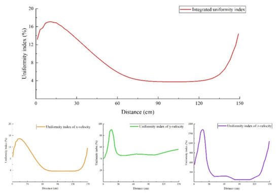 (3) Set the weight of the flow velocity in three directions. The weight ratio of the flow velocity in each direction was consistent with the ratio of the average flow velocity. Then the uniformity coefficients of each layer were calculated.
