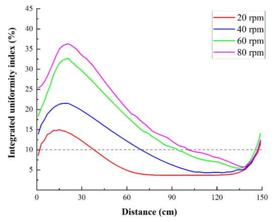 On the basis of the existing models, the wheel rotation speed was set at 20, 40, 60 and 80 rpm, respectively, for the numerical simulation. The uniformity distribution of the flow field at each rotational speed was obtained in straight II. It can be seen from Figure 7 where, taking the comprehensive uniformity coefficient 10% as the limiting condition, the corrected distances were 39, 71, 97 and 101 cm, respectively, and the corresponding uniform lengths were 106, 74, 50 and 46 cm. Corrected distance is positively correlated with rotational speed (average velocity), and the length of uniform section is negatively correlated with speed. Both of them have nonlinear correlation. This is because the increase in speed causes the fluid to collide more violently, leading to an increase in velocity inhomogeneity. When the speed is low, the correction distance and the length of uniform section change significantly with the increase in speed. When the speed reaches a certain degree, the influence of the increase of the speed on the correction distance and the length of uniform section is gradually weakened. In addition, the influence of outflow on velocity uniformity is much greater than that of inflow. The uniform section of the flow field in the flume is not distributed symmetrically on both sides of the center of the straight path. It is closer to the back end of the straight.